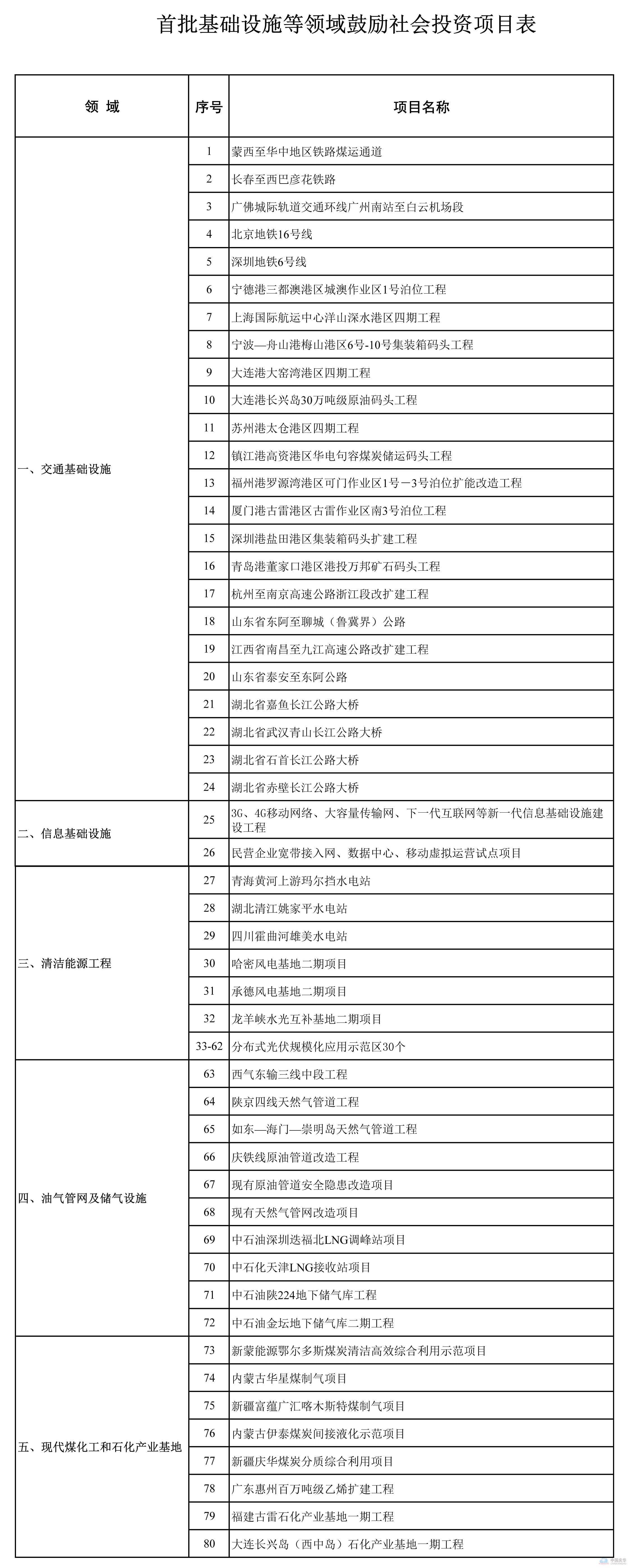 一、首批推出的基礎(chǔ)設(shè)施等領(lǐng)域鼓勵社會資本參與的80個項目涵蓋鐵路、公路、港口等交通基礎(chǔ)設(shè)施,新一代信息基礎(chǔ)設(shè)施,重大水電、風(fēng)電、光伏發(fā)電等清潔能源工程,油氣管網(wǎng)及儲氣設(shè)施,現(xiàn)代煤化工和石化產(chǎn)業(yè)基地等方面,鼓勵和吸引社會資本特別是民間投資以合資、獨資、特許經(jīng)營等方式參與建設(shè)及營運。